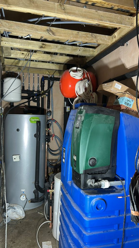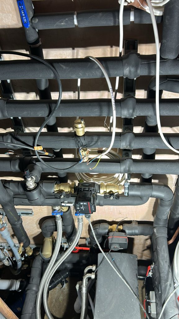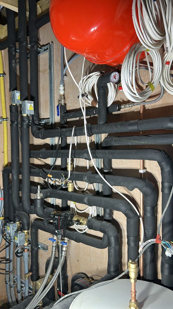 The plant room pipework was executed to a high professional standard, with clear zoning, full insulation, and precise component placement to allow for easy servicing and future upgrades. All systems were installed with the future ASHP connection in mind, ensuring seamless integration once the outdoor unit is commissioned.